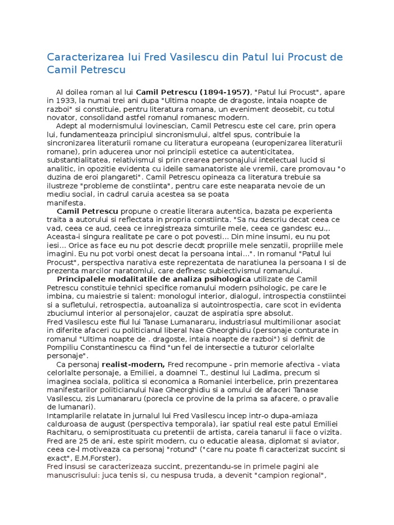 Caracterizarea Lui Fred Vasilescu Din Patul Lui Procust De Camil Petrescu