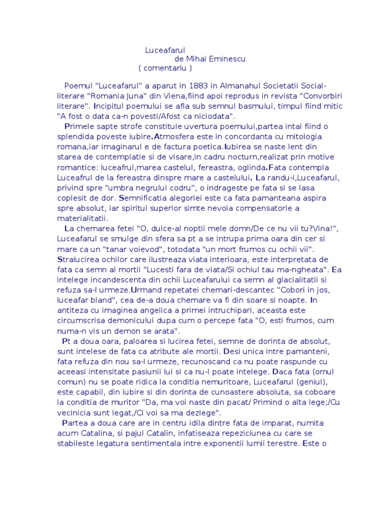 Comentarii Bacalaureat Luceafărul De Mihai Eminescu Wattpad