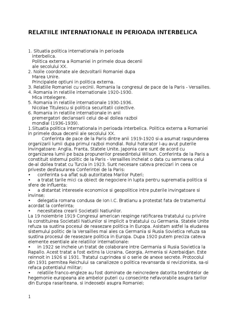 Evolutia Relatiilor Internationale In Perioada Interbelica