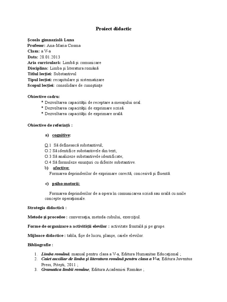 Proiect Didactic Limba Romana Substantivul Proiecte Ro