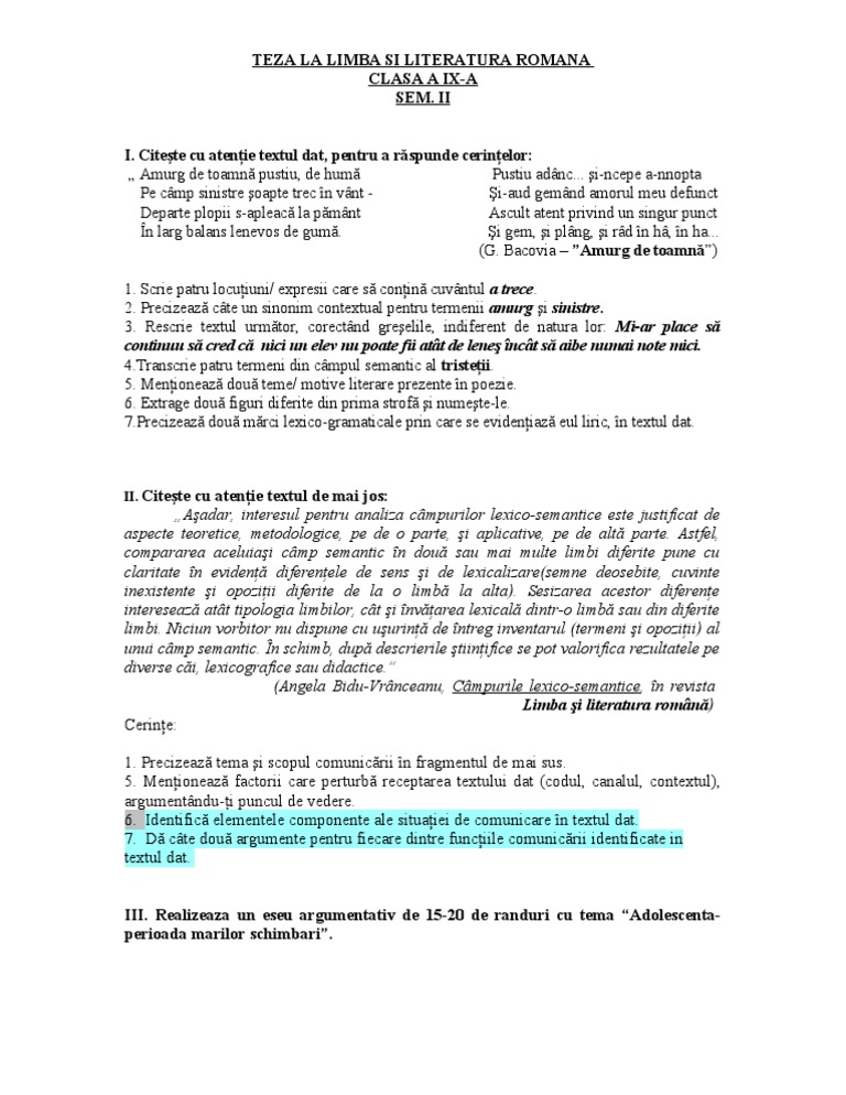 Teza Limba Romana Clasa A Ix A Limbă Romani Literatura